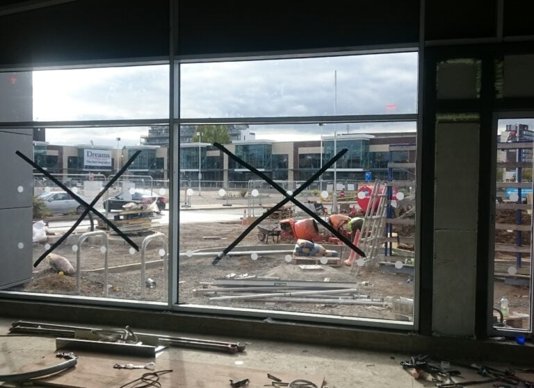 We were contacted by the site manager of a brand new Costa Coffee shop being built in Manchester. Tasked with installing manifestations to the large plate glass windows at the front of the shop we explained what was legally required to the site manager. Having agreed on a solution that both met the legal requirements and complied with the companies branding the manifestations were installed less than a week after initial contact was made with Tintfit.