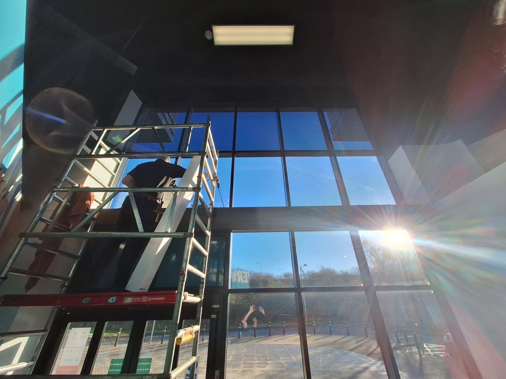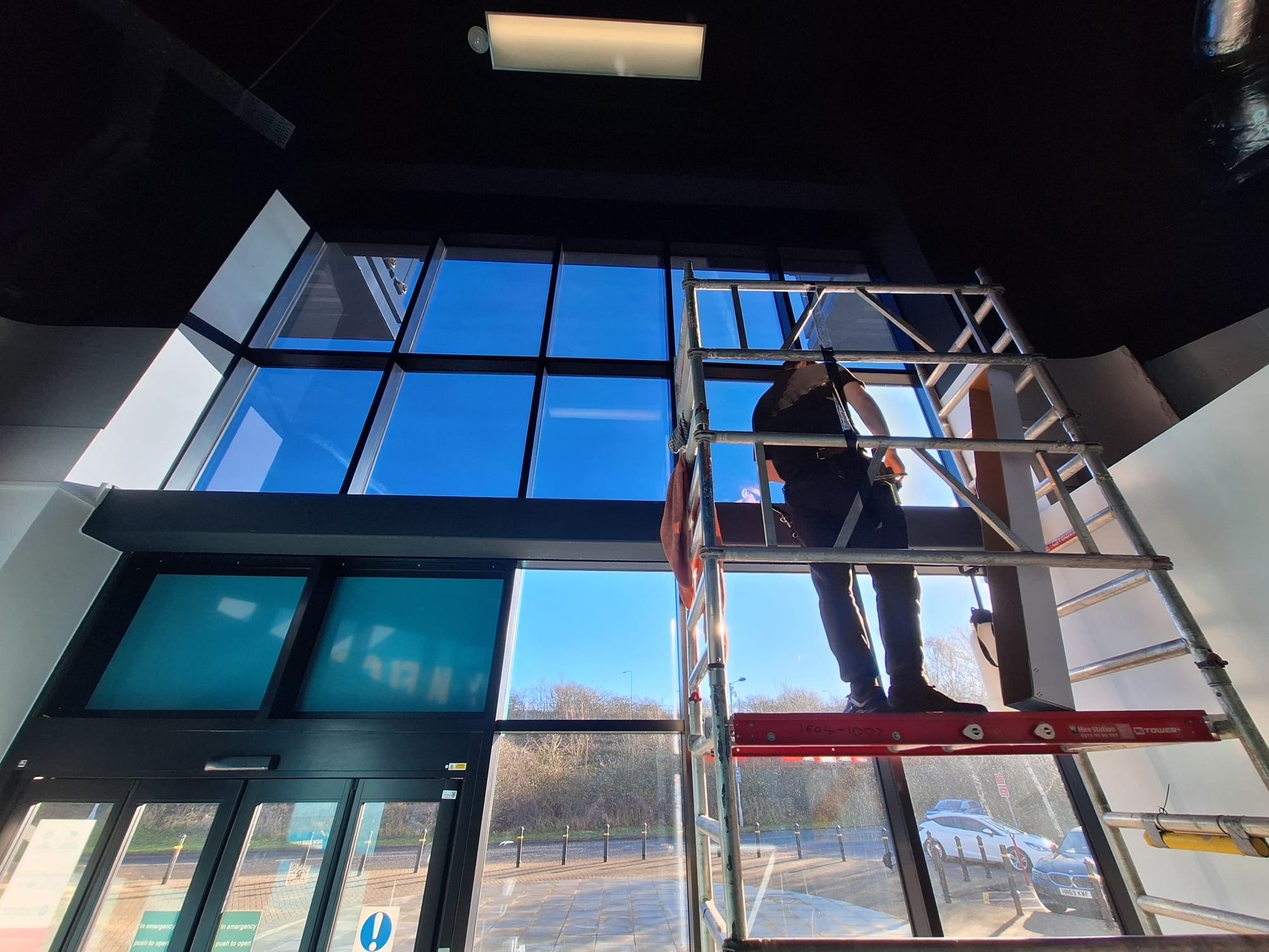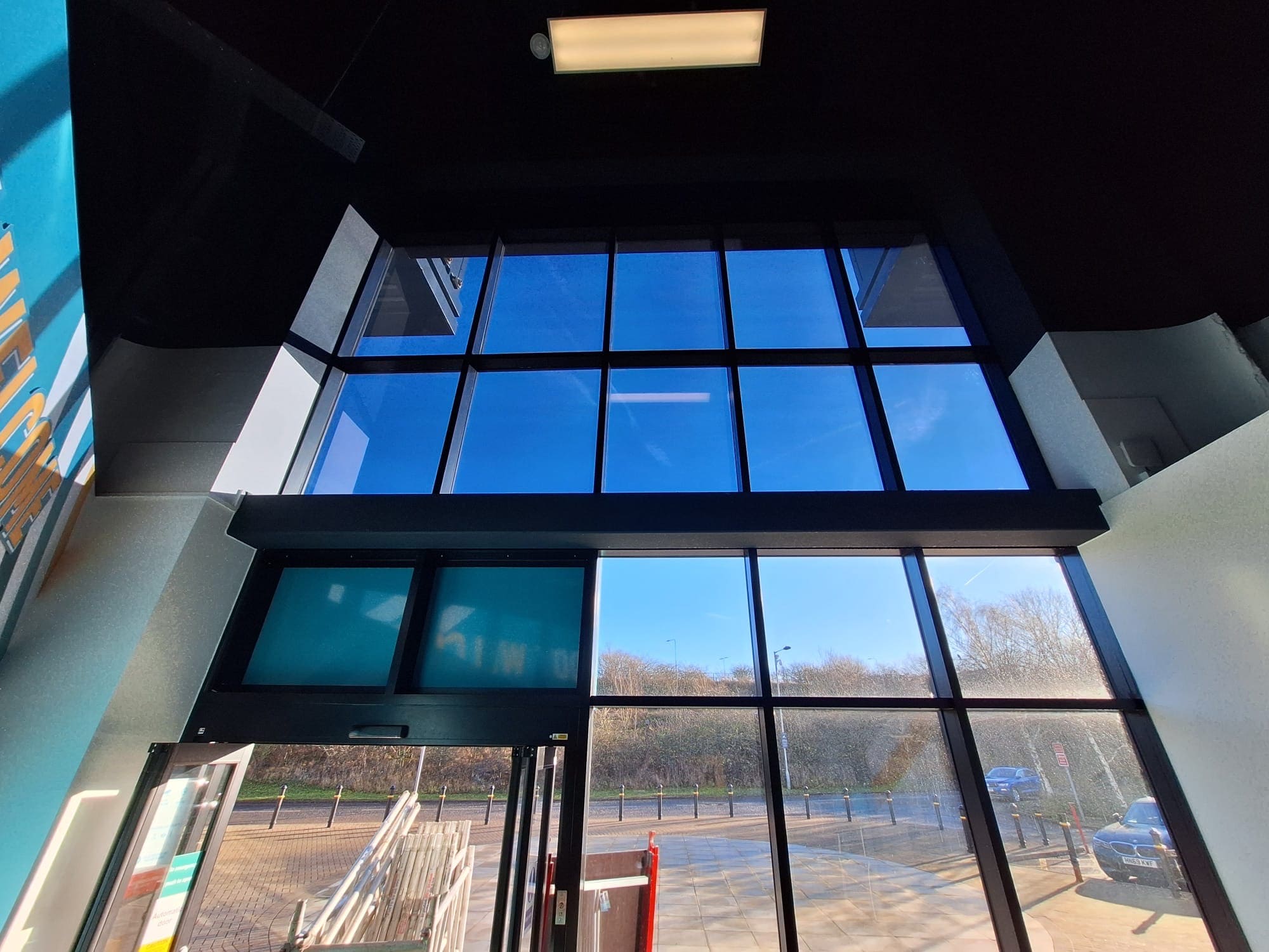 To tackle excessive glare disrupting the reception team at PureGym’s Teesside location, we applied Very Dark Reflective Privacy 10 Window Film to high-level windows. This specialised film not only resolved the issue but also enhanced the building’s overall appearance with its sleek, mirrored finish.
