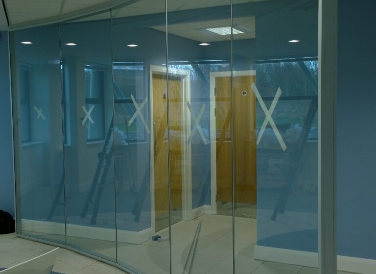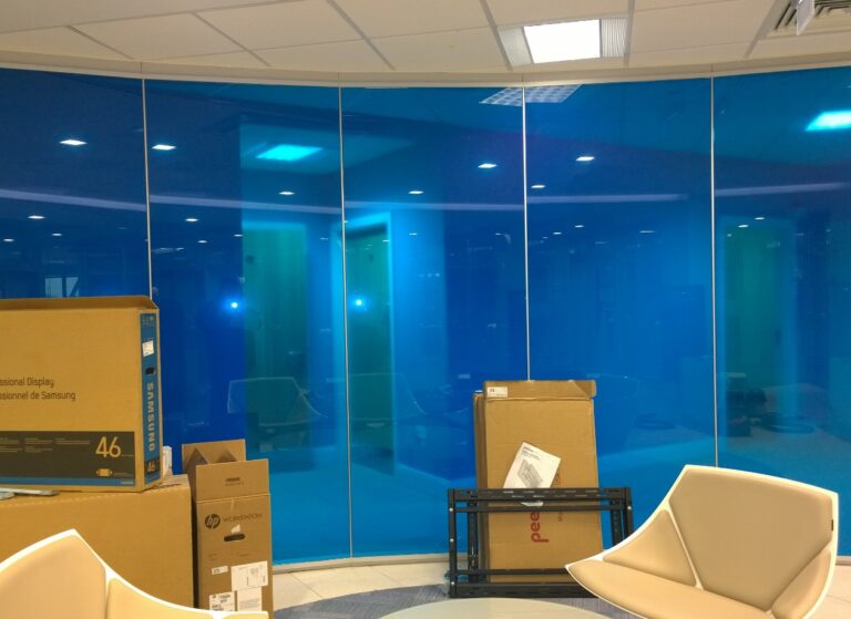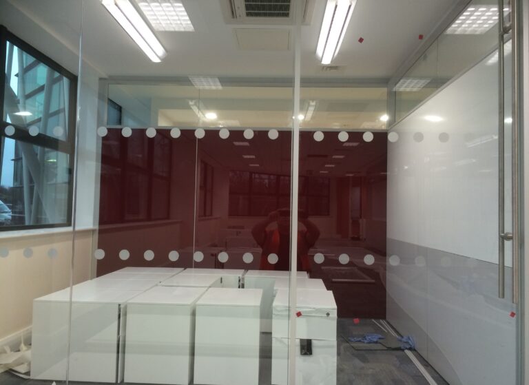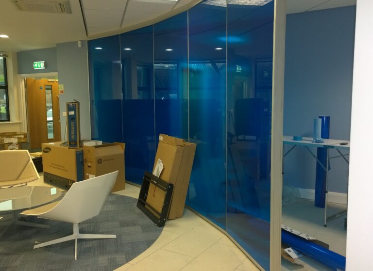 We were contacted by the manager of JACOBS Engineering Consultants to install vinyl and window film as well as manifestations to internal screens at their new office in Yorkshire. They wanted a blue colour scheme for their office so we provided the client with samples of various blue window films and vinyls. The client decided chose to go ahead with a 3M Blue vinyl and our Non-Reflective Light Blue 60 window film. Tintfit installed 170 linear metres of circle manifestations and fitted both 3M Blue vinyl and Non-Reflective Light Blue 60 window film to over 40m2 of internal screens.