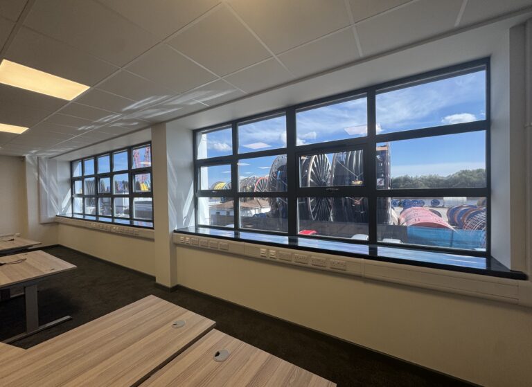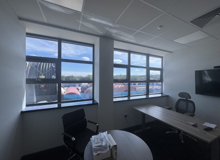 This time, our team fitted 132 m² of film across large glazed areas. From the outside, the glass now has a bold silver-mirror finish – sharp, professional, and completely private during the day. From the inside, the film gives a clean dark blue/grey tone, reducing eye strain while still allowing occupants to enjoy the view out.